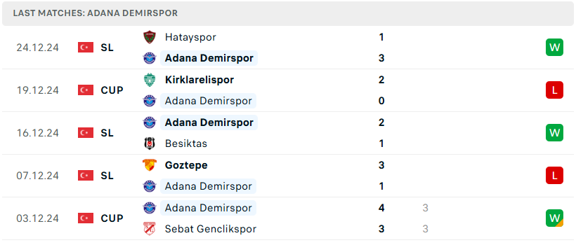 Sau chuỗi trận đáng thất vọng dẫn đến việc phải thay tướng, Adana Demirspor dường như đang cho thấy những dấu hiệu tích cực trở lại. Từ đầu mùa giải, họ chỉ giành được 2 chiến thắng sau 16 vòng đấu, nhưng đáng chú ý là cả hai chiến thắng này đều đến ở hai vòng gần nhất. Mặc dù vẫn đứng cuối BXH, nhưng chính sự cải thiện trong phong độ gần đây cho thấy họ không thể bị xem thường. Trận đấu sắp tới trước Istanbul BB chắc chắn là một cơ hội, dù không dễ dàng, để Adana tiếp tục xây dựng đà hồi phục.
