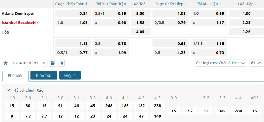 Bảng tỷ lệ kèo bóng đá trận đấu Adana Demirspor vs Istanbul BB