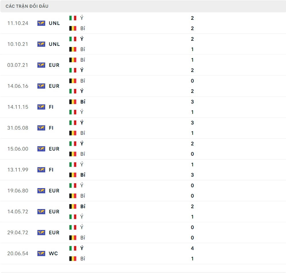 Trận lượt đi tại xứ Mỳ ống cũng là lần gặp nhau gần nhất giữa hai đội, Italia và Bỉ đã chia điểm sau trận hòa 2-2. Thế nhưng nên nhớ hôm đó Azzurri đã phải chơi thiếu người từ khá sớm. Thế nên dù là những người “nằm dưới” thì đây vẫn là chuyến đi mà các học trò HLV Luciano Spalletti sẽ có điểm.