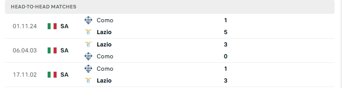 Những màn đụng độ giữa Lazio và Como thường diễn ra hấp dẫn với nhiều bàn thắng được tạo ra, 3 lần đụng độ của hai đội trong quá khứ khép lại 90 phút từ 3 bàn thắng trở lên và trận đón tiếp Como trên sân nhà của Lazio cũng khép lại với 3 bàn.