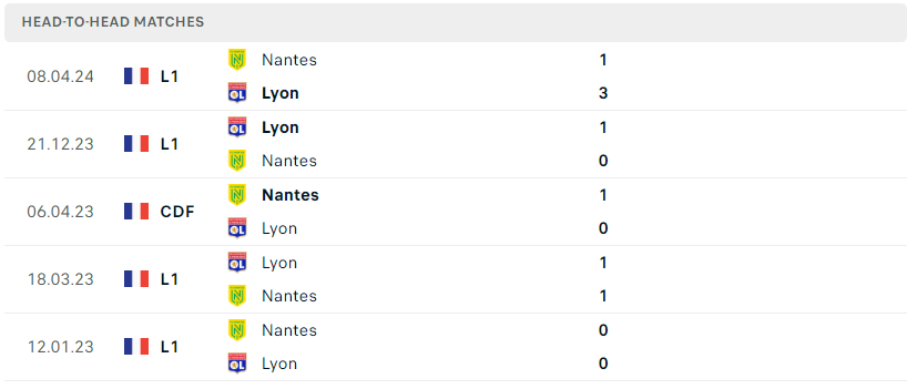 Thành tích đối đầu của Lyon vs Nantes