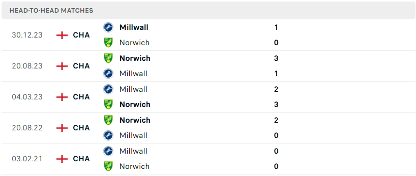 Trong lần gặp nhau gần nhất, Millwall cũng đã xuất sắc vượt qua Norwich với tỉ số tối thiểu. Một chiến thắng mang ý nghĩa lớn, bởi đây là lần đầu tiên họ làm được điều này kể từ năm 2017. Kết quả này không chỉ là minh chứng cho sự tiến bộ của Millwall mà còn phơi bày rõ nét sự sa sút đáng kể của Norwich trong thời gian qua. Với lối đá kỷ luật và sự khởi sắc, Millwall hoàn toàn có thể tái hiện kịch bản cũ.