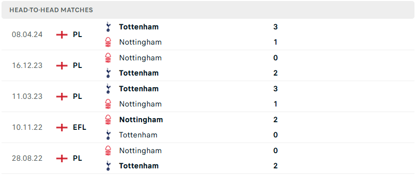 Thành tích đối đầu của Nottingham Forest vs Tottenham