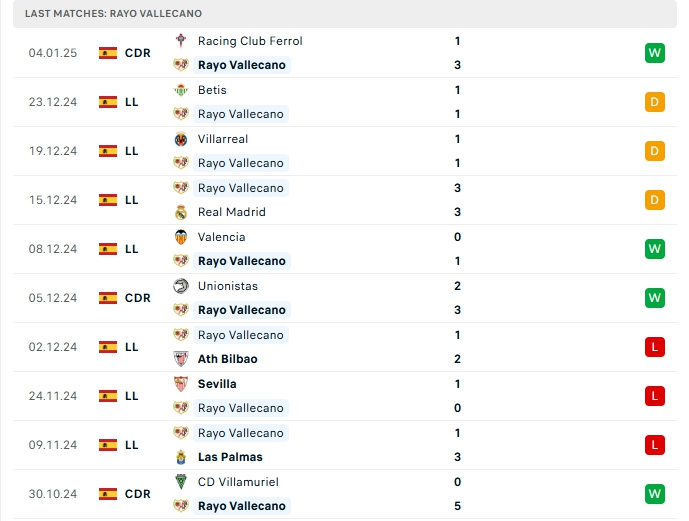 Rayo Vallecano vừa qua có chiến thắng trước Racing Club Ferrol ở đấu trường cup, còn ở Laliga họ có cho mình trận hòa trước Betis, trận hòa này là trận bất bại thứ 4 liên tiếp của họ ở 4 vòng đấu gần nhất, trải qua 18 trận đấu, Rayo Vallecano có cho mình 5 chiến thắng, 7 hòa cùng 6 thất bại, mang về 22 điểm và đang xếp vị trí thứ 12 trên BXH, hàng công của Rayo Vallecano mang về 20 bàn thắng cùng hàng thủ nhận 21 bàn thua sau 18 trận đấu, 3/5 trận vừa qua của Rayo Vallecano khép lại không quá 2 bàn, trên sân nhà của mình Rayo Vallecano có được 12 bàn thắng cùng hàng thủ nhận 13 bàn thua sau 8 trận đấu.