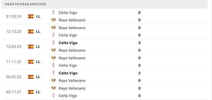 Rayo Vallecano và Celta Vigo ở 4/5 lần gặp nhau gần nhất đều khép lại với tỷ số hòa 0-0, với hàng công không được đánh giá cao đến từ 2 đội, cùng sự chặt chẻ trong lối chơi sẻ khiến trận đấu diễn ra với tốc độ chậm, khi đó bàn thắng khó lòng xuất hiện trong màn đối đầu này.