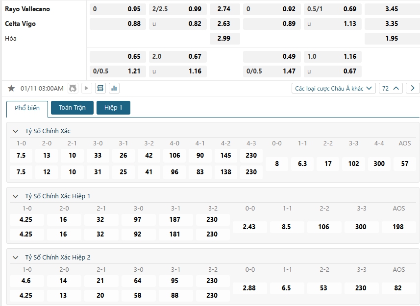 Bảng tỷ lệ kèo bóng đá trận đấu Rayo Vallecano vs Celta Vigo