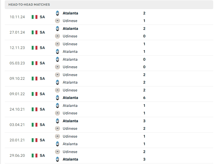 Lịch sử thi đấu của Udinese vs Atalanta