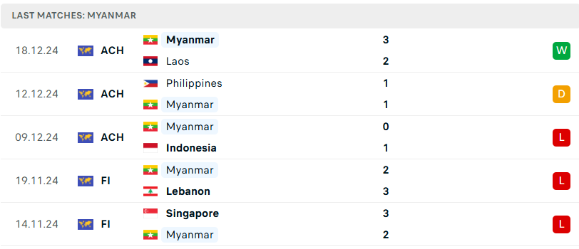 Trái ngược với sự ổn định của Việt Nam chính là sự bất ổn của Myanmar. Chiến thắng chật vật 3-2 trước Lào vào đêm qua đã để thắp lên hy vọng đi tiếp cho họ với 4 điểm sau 3 lượt trận. Dẫu vậy, màn trình diễn của đội tuyển này nhìn chung vẫn rất đáng thất vọng. Một lối chơi thiếu hiệu quả, cộng thêm những biến động trong và ngoài sân cỏ đã khiến Myanmar gặp nhiều khó khăn. Trận đấu tới chắc chắn sẽ là thử thách lớn đối với họ khi buộc phải giành chiến thắng nếu muốn đi tiếp.