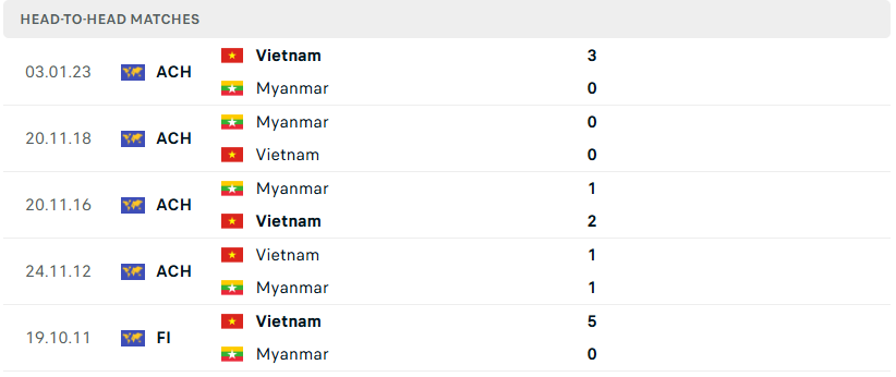 Lịch sử thi đấu cũng đang ghi nhận sự áp đảo tuyệt đối của binh đoàn áo đỏ, khi Việt Nam đã thắng 3 và hòa 2 trong 5 lần gặp nhau gần nhất. Kể từ năm 2010, bóng đá Myanmar chưa từng vượt qua Việt Nam, điều này càng khẳng định sự khác biệt về bản lĩnh và đẳng cấp giữa hai đội. Với cục diện hiện tại, một chiến thắng nữa dành cho Việt Nam là điều rất khả thi.