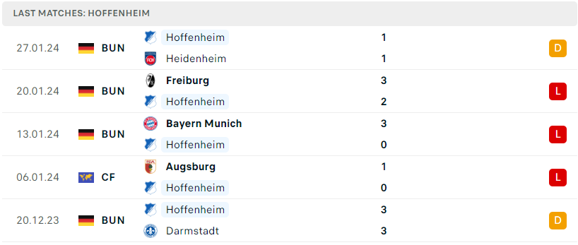 Phía bên kia, một cái tên khác cũng đang trình diễn một bộ mặt hết sức nhạt nhòa trong 2 tháng vừa qua chính là Hoffenheim, đoàn quân Matarazzo thi đấu một cách thiếu quyết đoán và hậu quả là việc họ đã không thắng trong cả 6 lần ra sân liên tiếp. Đáng nói, trong số này thì tập thể vùng Kraichgau đã để thua đến 4 trận. Thực tế, vị trí thứ 8 trên BXH là chưa đủ để họ chứng minh được thực lực. Nếu không nhanh chóng trở lại, thì thứ hạng của họ sẽ còn tiếp tục rơi rớt trong tương lai.