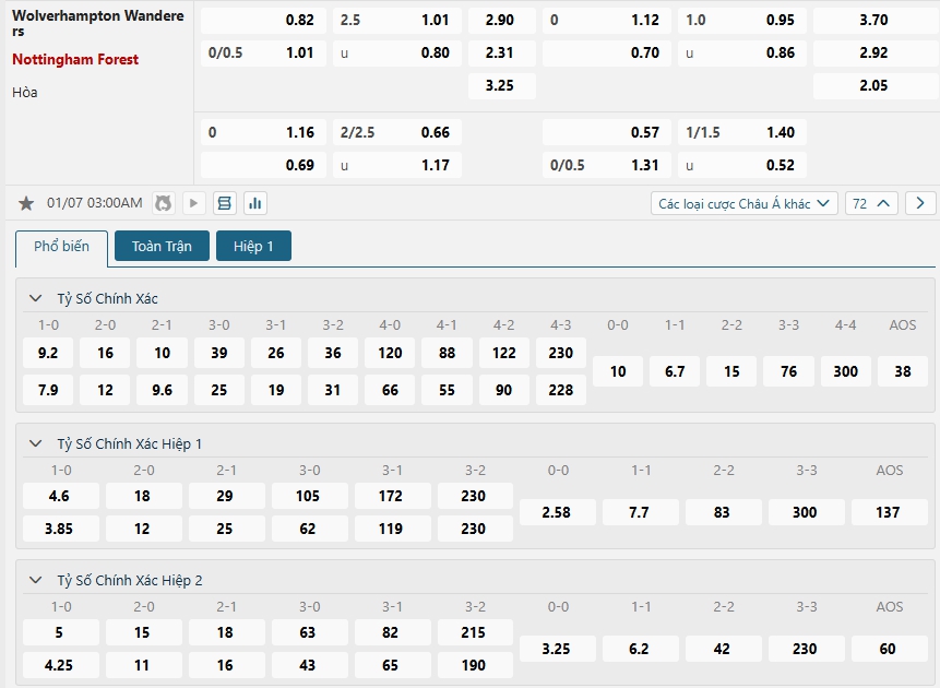 Kèo Châu Âu vẫn đang là sự ưu ái cho các vị khách khi tỷ lệ cho chiến thắng của họ chỉ là 2.31 trong khi con số này bên phía các cầu thủ chủ nhà đang là 2.90. Chênh lệch là không quá lớn, tuy vậy nhìn vào màn trình diễn của cả hai cùng sự đối lập về thành tích sân nhà và sân khách đang khiến Wolves đứng trước nguy cơ nhận thêm thất bại, ngược lại Nottingham Forest sẻ tiếp tục chứng minh năng lực của mình ở mùa giải năm nay.