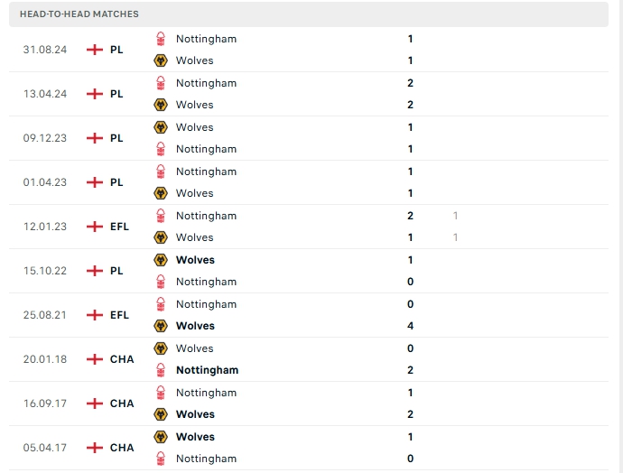Lần đụng độ gần nhất của hai đội trên sân của Wolves , khép lại với tỷ số hòa 1-1, nơi mà Wolves được đánh giá cao hơn, còn thời điểm hiện tại mọi ưu thế ủng hộ các vị khách Nottingham Forest, và họ sẻ tận dụng tốt để có được chiến thắng cho mình.